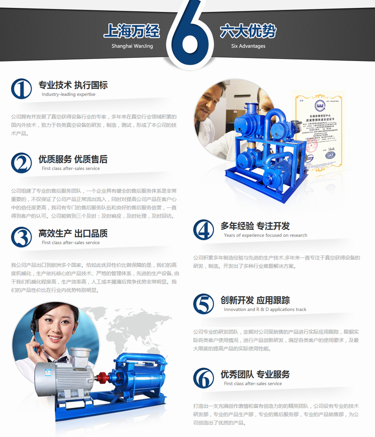 上海萬經(jīng)泵業(yè)制造有限公司是一家集生產(chǎn),銷售,研發(fā)于一體的企業(yè)。公司多年來憑借完善的質(zhì)量管理體系,先進(jìn)的加工設(shè)備和加工工藝,及先進(jìn)的檢測手段,高素質(zhì)的隊(duì)伍,研發(fā)制造銷售上萬臺國內(nèi)先進(jìn)水平的真空設(shè)備。公司己通過ISG9001-2008質(zhì)量管理體系認(rèn)證。公司主要產(chǎn)品有水環(huán)式真空泵,旋片式真空泵,羅茨真空機(jī)組,成套真空設(shè)備。公司生產(chǎn)的各類真空產(chǎn)品廣泛地應(yīng)用于航空、電子、化工、醫(yī)藥、環(huán)保、煉油、冶金、紡織、食品、環(huán)保等高科技領(lǐng)域。